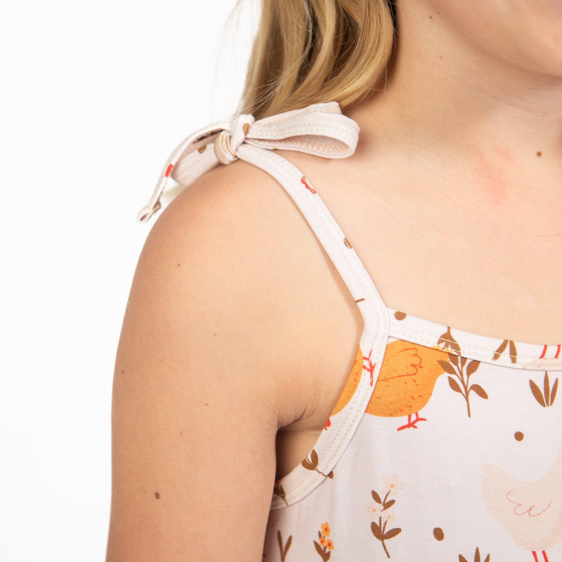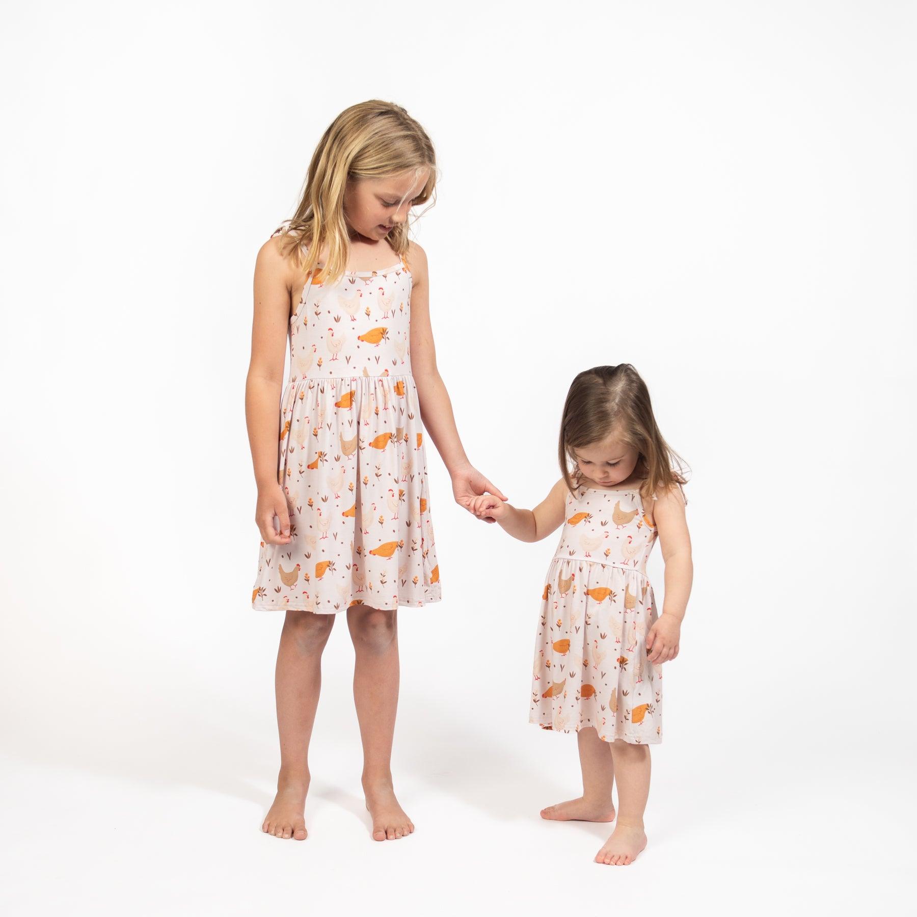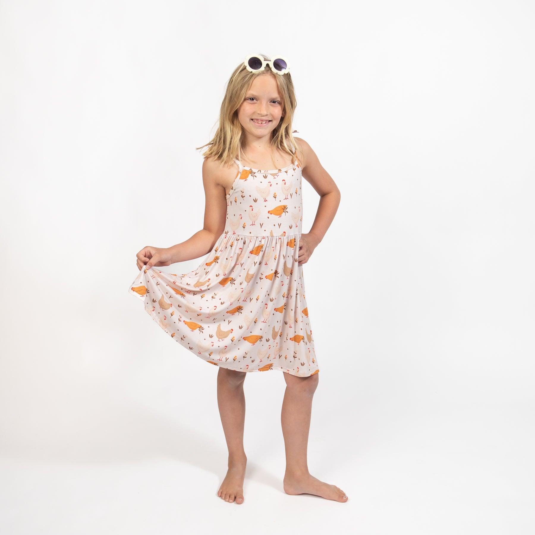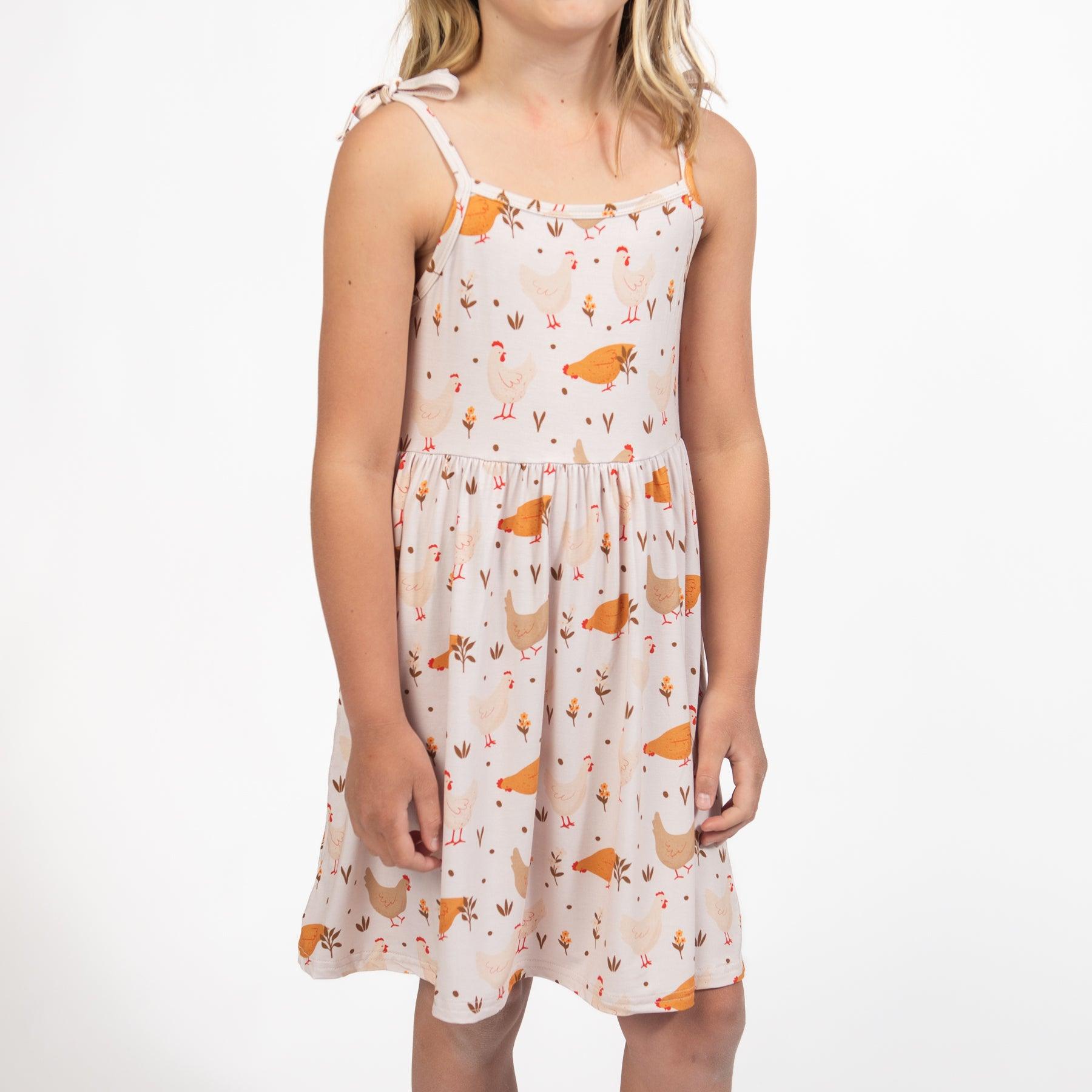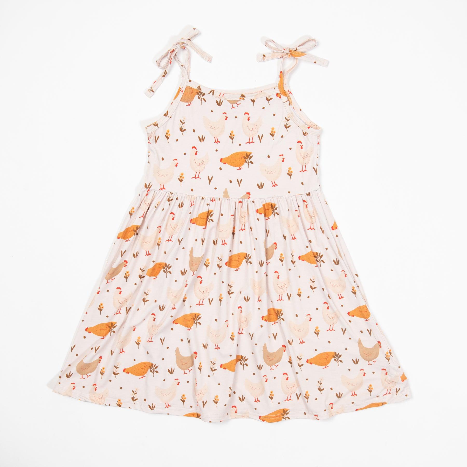 Get your little one ready for an adorable day in this Cottage Chicken Bamboo Dress! With its fun chicken design and super soft bamboo fabric. your child will be both stylish and comfortable. Flowy and featuring tie straps. this dress is perfect for any toddler or youth.
