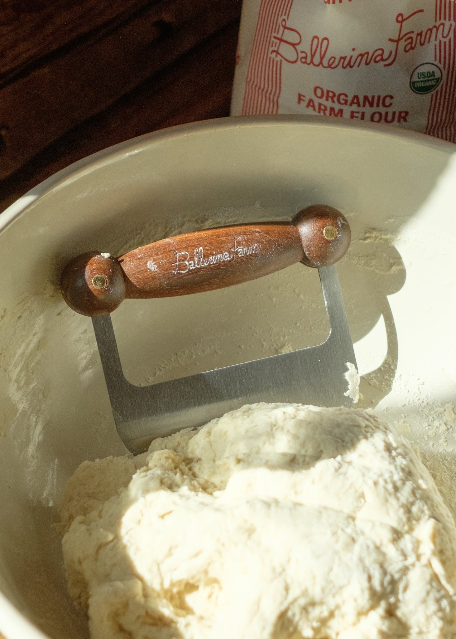 We are welcoming a new bench scraper to the farm kitchen, made with a hand-turned teak wood handle and designed with the guidance of a local woodworker. Made to fit perfectly in your palm with a stainless steel blade, brass accents, and our updated logo, you’re ready to cut dough or scrape your kitchen table with ease. The updated curved corner blade helps to scape the sides of your bowl, assuring you don’t waste anything.